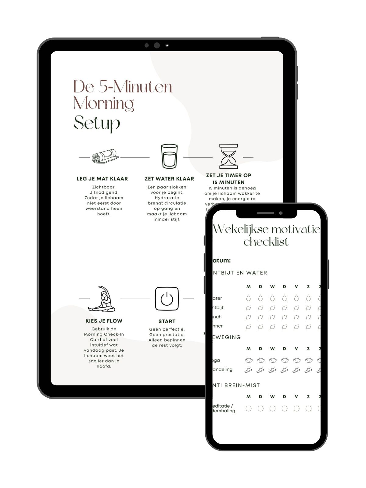 Een mini‑voorbereiding en een eenvoudige checklist die je door je ochtendritueel leidt, die je ochtend frictieloos maakt: mat klaar, water klaar, timer aan, flow kiezen, beginnen. Het haalt alle drempels weg zodat je zonder nadenken kunt starten. Het geeft structuur aan je routine en maakt het makkelijk om consistent te blijven en maakt je vooruitgang zichtbaar op een lichte, haalbare manier.